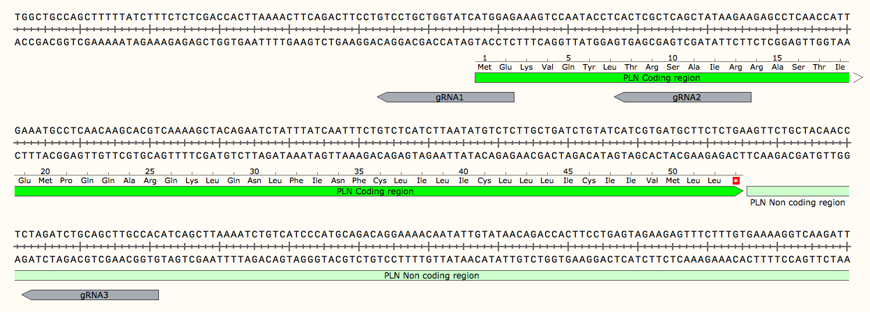 The sgRNA expressing vector contains SpCas9 gene driven by CBh promoter and the 20 nucleotides guide RNA sequences are transcribed by U6 promoter with an invariant gRNA scaffold immediately following the guide RNA sequences. The guide sequences of PLN are: gRNA1: CTCCATGATACCAGCAGGAC, gRNA2: TTCTTATAGCTGAGCGAGTG, gRNA3: GTGGCAAGCTGCAGATCTAG.