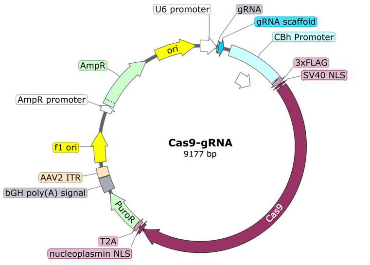 - Co-expresses SpCas9 protein and pre-cloned gRNA