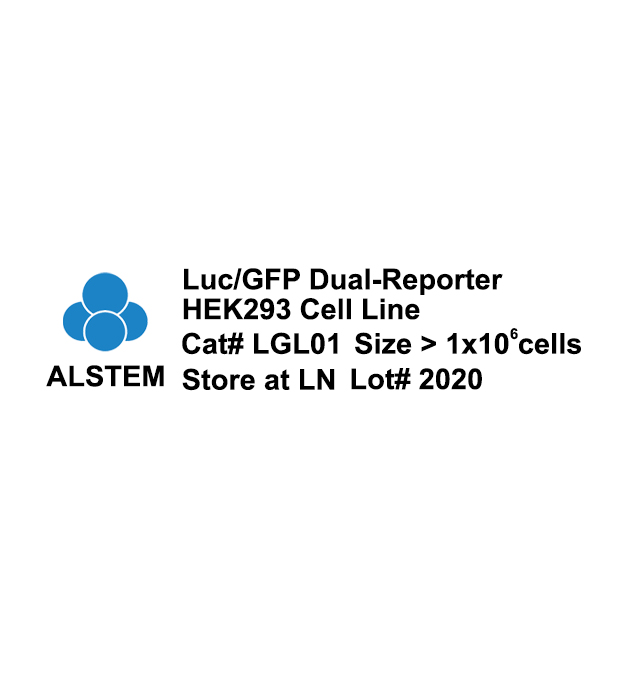Luciferase catalyzes the substrate luciferin in the presence of Mg2+ and ATP, resulting in a flash of light that decays rapidly. This light can be detected by a luminometer. Luciferase from the firefly has become one of the more widely used reporter proteins for both in vitro and in vivo studies, such as, gene transcription activity assay, the noninvasive imaging of reporter gene expression, imaging cerebral strokes, and tracking genetically engineered T cells. Luciferase/GFP dual-reporter HEK293 (HEK293-Luc-GFP) cell line is derived from HEK293 cells by transduction of ALSTEM’s pLenti-CAG-Luciferase-PGK-GFP-T2A-PURO Lentiviral Reporter (cat# LV311G) lentivirus, which contains Firefly luciferase encoding gene driven by CAG promoter, followed by GFP and puromycin resistance gene by PGK promoter. This cell line stably expresses luciferase at high level. It also expresses a green fluorescent protein (GFP) and is resistant to puromycin. This cell line will be a very useful cell line for non-invasive visualization in both in vitro and in vivo experiments.